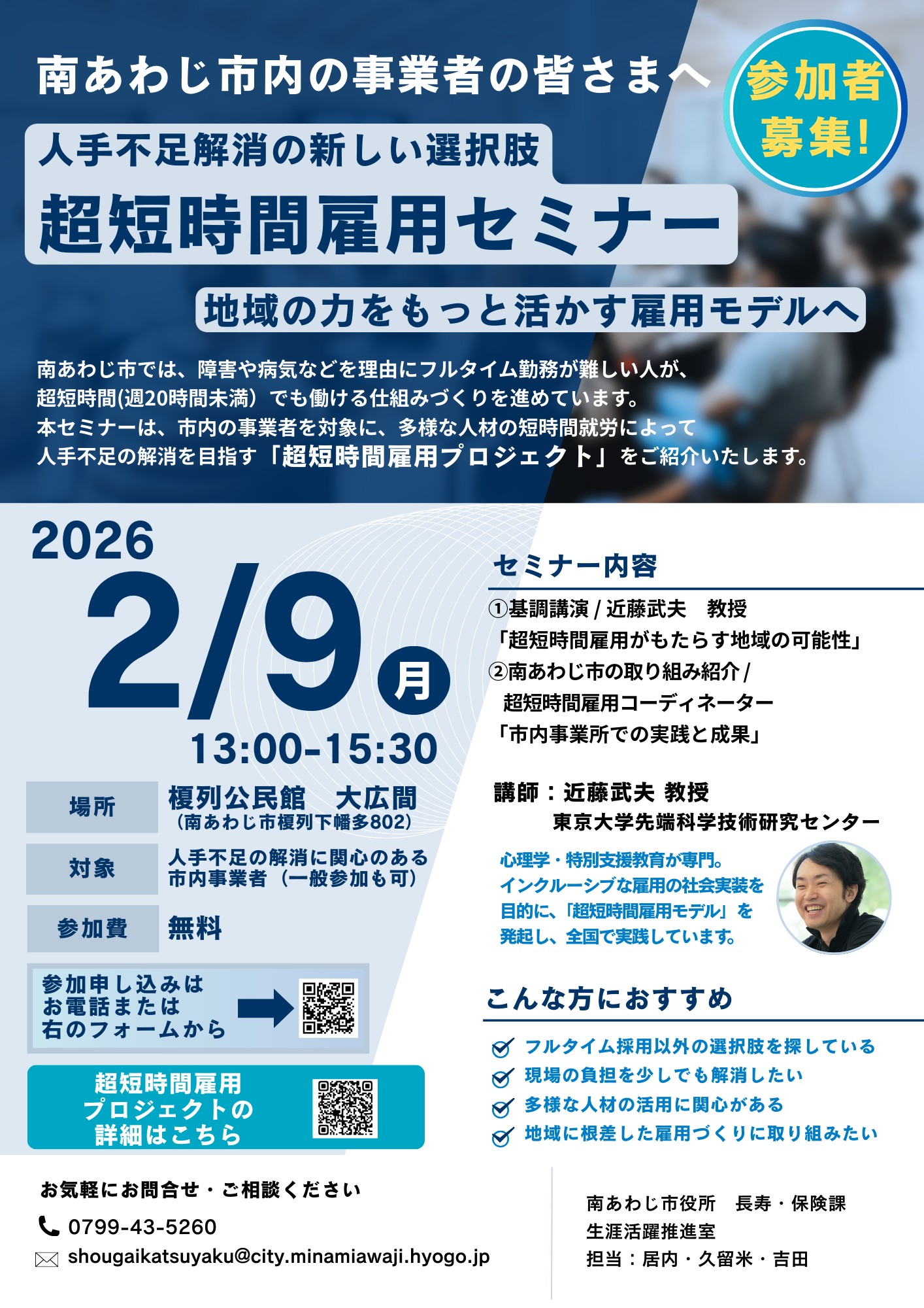- 南あわじ市では、フルタイム勤務が難しい人が週20時間未満でも働ける仕組みづくりを進めています。本セミナーではそういった短時間就労によって人手不足の解消を目指す「超短時間雇用プロジェクト」をご紹介いたします。興味のある方はお気軽にご参加ください。